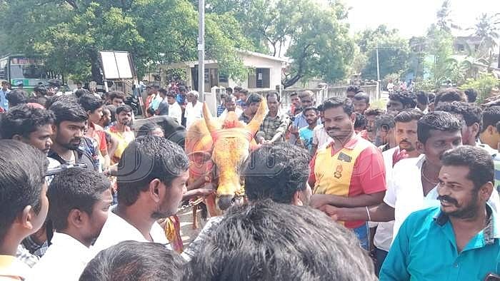 போராட்டத்திற்கு அழைத்து வரப்படும் ஜல்லிக்கட்டு காளைகள்