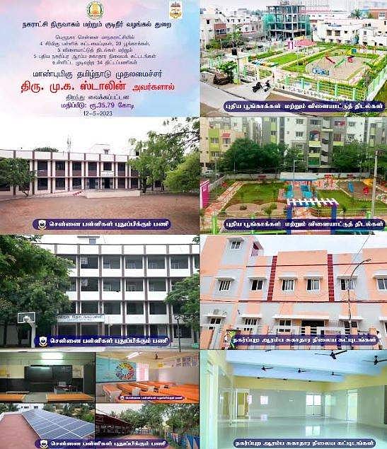 நகராட்சி நிர்வாகம் மற்றும் குடிநீர் வழங்கல் துறையின் பெருநகர சென்னை மாநகராட்சி சார்பில் 35 கோடியே 79 லட்சம் ரூபாய் செலவில் பள்ளிகள் புதுப்பிக்கும் பணிகள், 19 புதிய பூங்காக்கள் அமைக்கும் பணிகள், ஒரு பூங்கா மறுசீரமைக்கும் பணி, 5 புதிய விளையாட்டு திடல்கள் அமைக்கும் பணிகள், 5 நகர்ப்புர ஆரம்ப சுகாதார நிலையக் கட்டடங்கள் கட்டும் பணிகள் ஆகிய முடிவுற்ற பணிகளை சென்னை தலைமைச் செயலகத்தில் காணொலி வாயிலாக முதல்வர் திறந்து வைத்தார்.