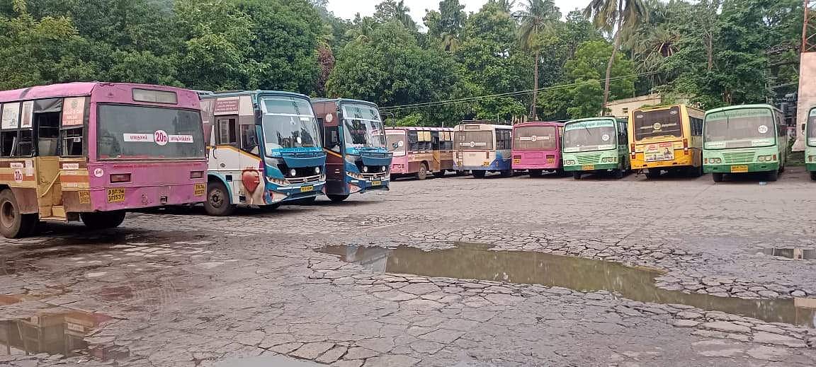 தொழிலாளர்கள் போராட்டத்தால் பணிமனையில் நிறுத்தப்பட்டுள்ள பேருந்துகள்