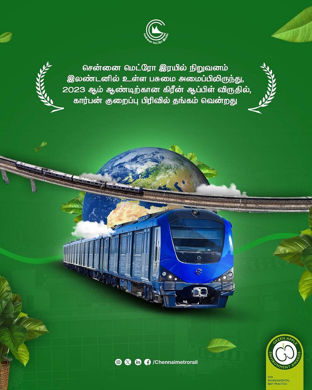 சென்னை மக்களின் பெரும் வரவேற்பை பெற்றுள்ள சென்னை மெட்ரோ ரயில் நிறுவனத்துக்கு லண்டனின் பசுமை அமைப்பு வழங்கும் கிரீன் ஆப்பிள் விருதை வென்றுள்ளது.