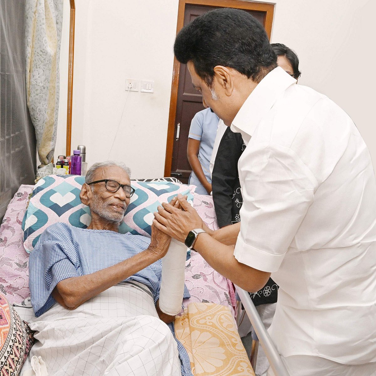 உலக தமிழர் பேரமைப்பின் தலைவர் பழ.நெடுமாறனின் வீட்டுக்கு நேரில் சென்ற முதல்வர் மு.க.ஸ்டாலின் அவரது உடல்நலம் குறித்து விசாரித்தார்.