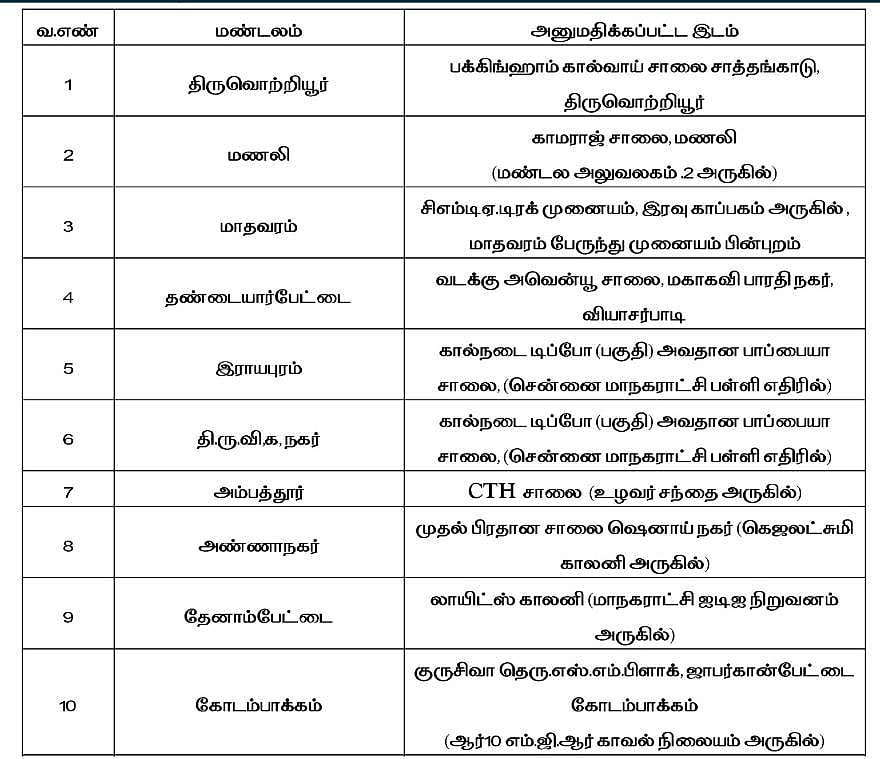 பெருநகர சென்னை மாநகராட்சிக்குட்பட்ட 15 மண்டலங்களில் ஒதுக்கீடு செய்யப்பட்டுள்ள இடங்களில் மட்டுமே குறைந்த அளவில் உருவாக்கப்படும் கட்டடக் கழிவுகளை கொட்ட வேண்டும்.