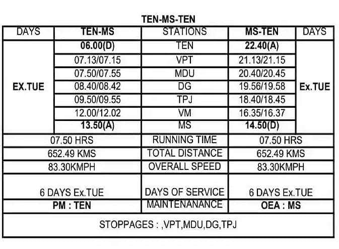 நாள்தோறும் காலை 6 மணிக்கு திருநெல்வேலியில் இருந்து புறப்படும் இந்த ரயில், விருதுநகர், மதுரை, திண்டுக்கல், திருச்சி, விழுப்புரத்தில் நின்று பிற்பகல் 1.50 மணிக்கு சென்னை எழும்பூர் வந்தடையும்.