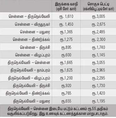 சொகுசு பெட்டியில் (எக்ஸிகியூட்டிவ் சோ் காா்) பயணக் கட்டணமாக ரூ.2,375, முன்பதிவுக் கட்டணம் ரூ.60, அதிவேக ரயிலுக்கான கட்டணம் ரூ.75, உணவு மற்றும் சிற்றுண்டிக்கு ரூ.369, ஜிஎஸ்டி வரி ரூ.126 என மொத்தமாக ரூ.3,005 வசூலிக்கப்படும்.