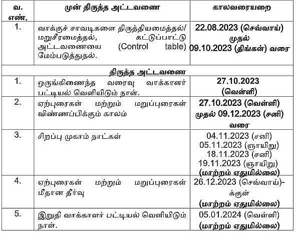 01.01.2024-ஐ தகுதியேற்படுத்தும் நாளாகக் கொண்டு புகைப்படத்துடன் கூடிய வாக்காளர் பட்டியல் சிறப்பு சுருக்கமுறை திருத்தத்தின் திருத்தப்பட்ட அட்டவணை பின்வருமாறு:-