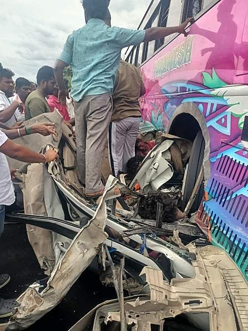 புதுக்கோட்டை அருகே காரும் தனியார் பேருந்தும் நேர் மோதி விபத்து: 3 பேர் பலி