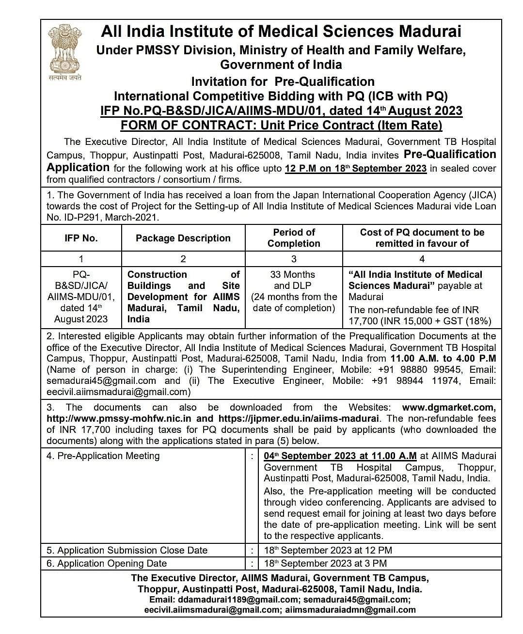 மேலும், கட்டுமானப் பணிகளை 33 மாதங்களுக்குள் முடிக்க வேண்டுமென்றும் அறிவுறுத்தப்பட்டுள்ளது.