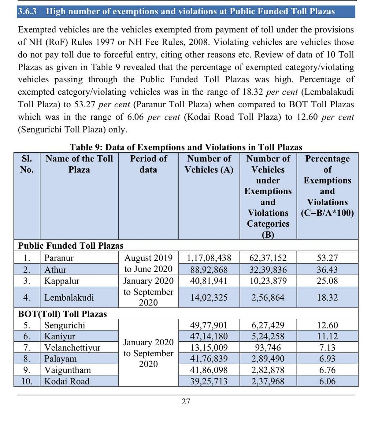 மேலும், ஜனவரி 2020 - செப்டம்பர் 2020 காலகட்டத்தில் கப்பலூர் சுங்கச்சாவடியில் 25.08%, லெம்பலகுடி சுங்கசாவடியில் 18.32%, செங்குறிச்சி சுங்கச்சாவடியில் 12.60, கனியூர் சுங்கசாவடியில் 11.12% வாகனங்களுக்கு சுங்கக் கட்டணம் வசூலிக்கவில்லை என்று அறிக்கையில் தெரிவிக்கப்பட்டுள்ளது.