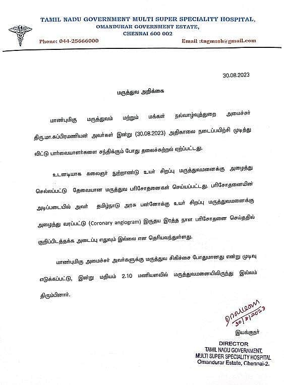 பரிசோதனை முடிவில், அவருக்கு குறிப்பிடத்தக்க அடைப்பு எதுவும் இல்லையென தெரியவந்தது. சில சிகிச்சைகள் மட்டும் அவருக்கு அளிக்கப்பட்டன. பிற்பகல் 2.10 மணி அளவில் அமைச்சா் மா.சுப்பிரமணியன் மருத்துவமனையிலிருந்து வீடு திரும்பினாா் என்று அரசு பன்னோக்கு உயா் சிறப்பு மருத்துவமனை செய்திக்குறிப்பில் தெரிவிக்கப்பட்டுள்ளது.