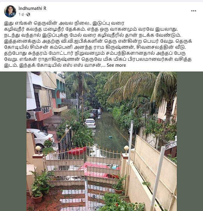 _ "இப்போது நிலைமை கட்டுக்குள் வந்திருக்கும் என நம்புகிறேன். 2007 அல்லது 2008-ல் கைக்குழந்தையான என் மகனை தோளில் சுமந்தபடி இதே கழிவு நீர் முழங்கால் அளவிற்கு மேல் வந்து நிற்க... இரவு முழுவதும் அப்படியே இருந்த ஞாபகம்... பிறகு 2015 ல்.. சாப்பிட எதுவும் கிடைக்காமல் ஒரு நாள் முழுவதும் பட்டினியாக... எல்லோருக்கும் துர்கா ஸ்டாலின் வரமுடியாது, எல்லோராலும் உட்லண்ட்ஸில் தங்க வசதி இருக்காது. இந்த நிலமை சாமானியனை இன்னும் வெகுவாக பாதிக்கும். இராதாகிருஷ்ணன் சாலையே இப்படி ஆனால் குப்பங்கள் நிலைமையை யோசித்தால்...???