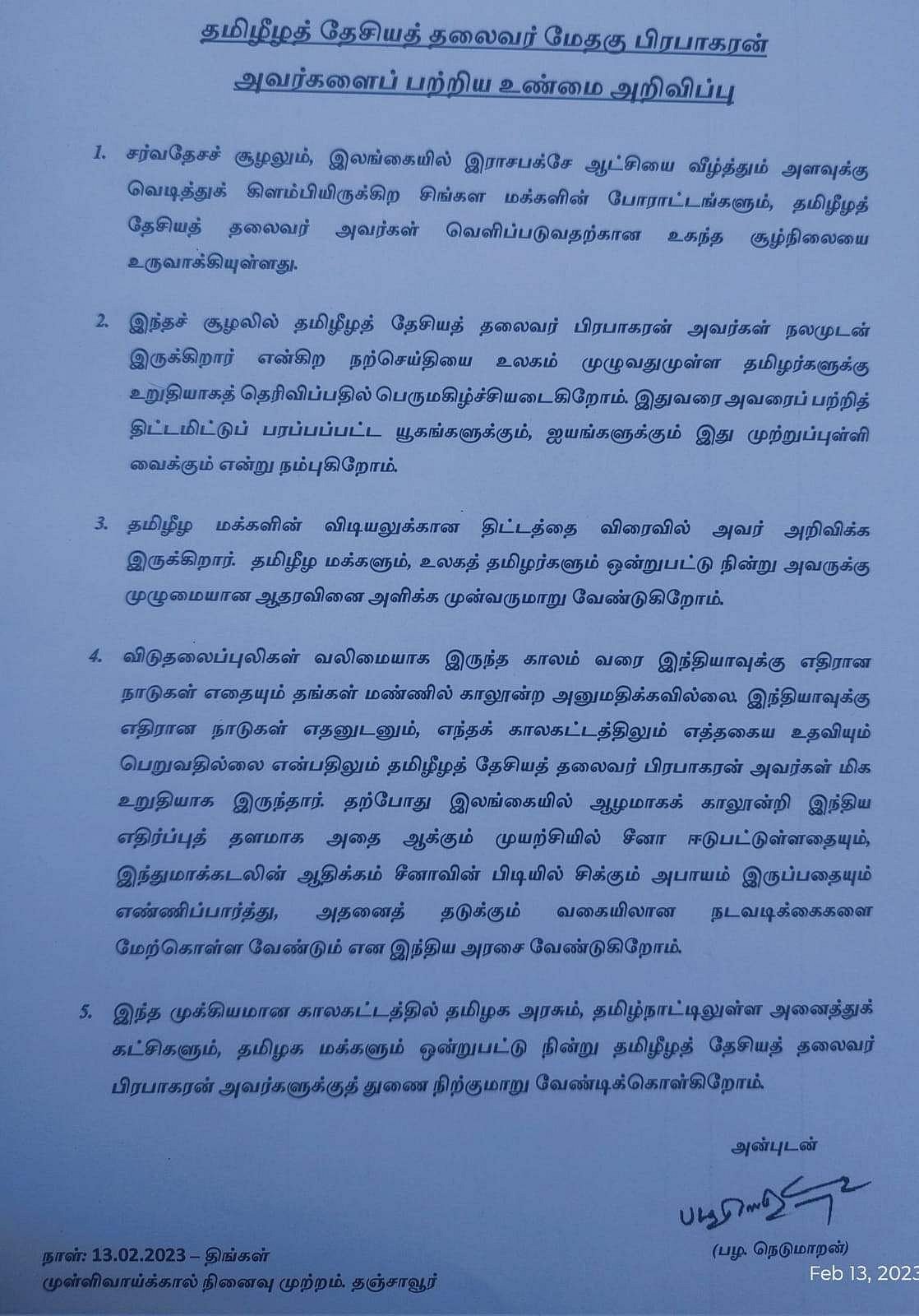 நெடுமாறன் வெளியிட்டுள்ள அறிக்கை