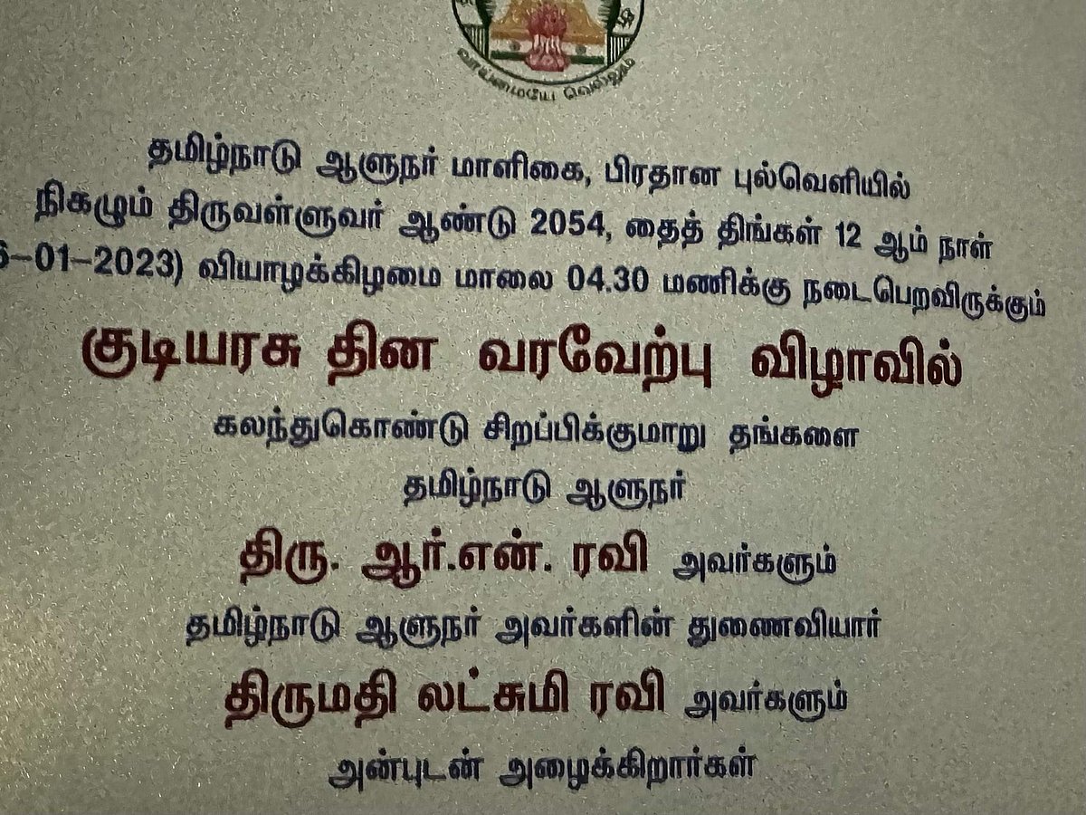 ஆளுநர் மாளிகையில் நடைபெறும் குடியரசு தின வரவேற்பு அழைப்பிதழில் மாநில அரசின் இலச்சினை இடம்பெற்றதுடன் தமிழ்நாடு என்றும் குறிப்பிடப்பட்டுள்ளது.