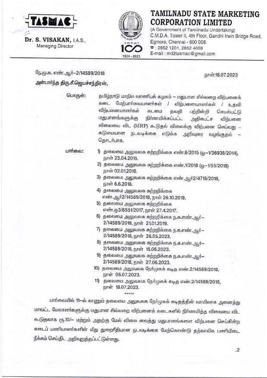 இந்நிலையில், நிர்ணயிக்கப்பட்ட விலையைவிட கூடுதலாக ரூ. 10 அல்லது அதற்கு மேல் மது விற்பனை செய்யும் கடை ஊழியர்களை பணியிடை நீக்கம் செய்ய மாவட்ட மேலாளர்களுக்கு சுற்றறிக்கை அனுப்பப்பட்டுள்ளது.