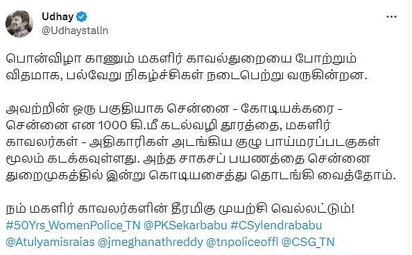 அதில் ஒரு பகுதியாக சென்னை முதல் கோடியக்கரை வரை சுமார் 1,000 கி.மீ கடல்வழி தூரத்தை 25 மகளிர் காவலர்கள் அடங்கிய குழு பயணம் செய்தது. இதுகுறித்து உதயநிதி ஸ்டாலின் தனது ட்விட்டர் பக்கத்தில் பதிவிட்டுள்ளார்.