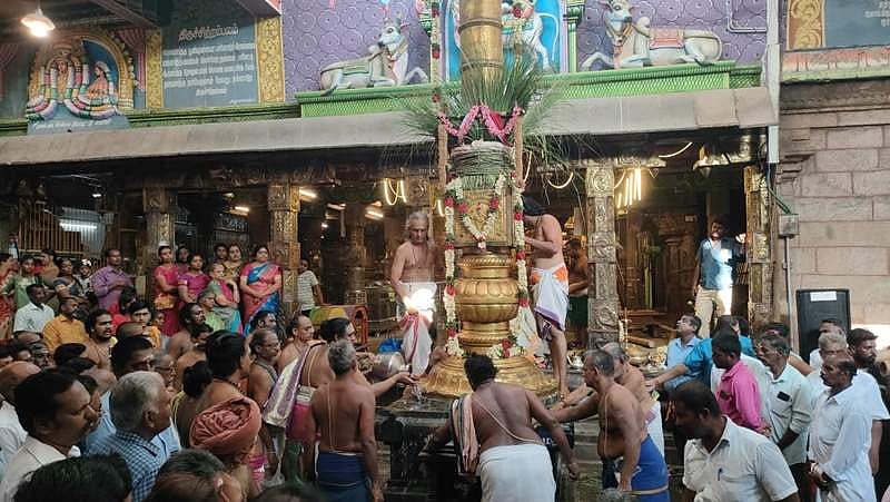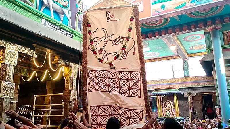முறைப்படி உற்சவம் தொடங்கும் வகையில் செவ்வாய்க்கிழமை காலை 5.30-க்கு மேல் சிறப்பு பூஜைகள் செய்யப்பட்டது. 7.30 மணிக்கு மேல் கம்பத்தில் ரிஷபக் கொடி ஏற்றப்பட்டது. கொடியேற்றத்துக்கு முன்னதாக கம்பத்தில் ஏற்றப்படும் கொடியை பல்லக்கில் வைத்து நான்கு வீதிகளின் வழியாக கோயிலுக்கு கொண்டுவந்தனர்.