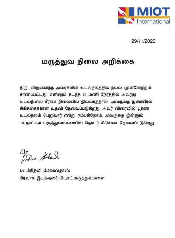 'விஜயகாந்தின் உடல்நலத்தில் நல்ல முன்னேற்றம் காணப்பட்டது. எனினும் கடந்த 24 மணி நேரத்தில் அவரது உடல்நிலை சீரான நிலையில் இல்லாததால், அவருக்கு நுரையீரல் சிகிச்சைக்கான உதவி தேவைப்படுகிறது. அவர் விரைவில் பூரண உடல்நலம் பெறுவார் என்று நம்புகிறோம். அவருக்கு இன்னும் 14 நாட்கள் மருத்துவமனையில் தொடர் சிகிச்சை தேவைப்படுகிறது' என்று தெரிவிக்கப்பட்டுள்ளது.