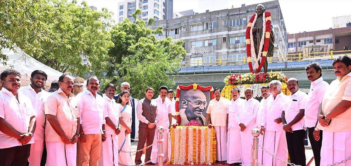 மகாத்மா காந்தியின் பிறந்தநாளையொட்டி சென்னை எழும்பூரில் உள்ள காந்தியின் முழு உருவச் சிலைக்கு ஆளுநர் ஆர்.என். ரவி, முதல்வர் மு.க. ஸ்டாலின் ஆகியோர் மரியாதை செலுத்தினர்.