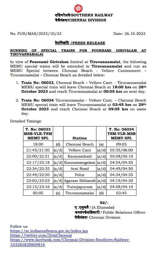 அதுபோல, திருவண்ணாமலையில் இருந்து அக். 29 ஆம் தேதி அதிகாலை 3.45 மணிக்கு புறப்படும் ரயில் சென்னை கடற்கரையை 9.05 மணிக்கு சென்றடையும் என்று தெரிவிக்கப்பட்டுள்ளது.