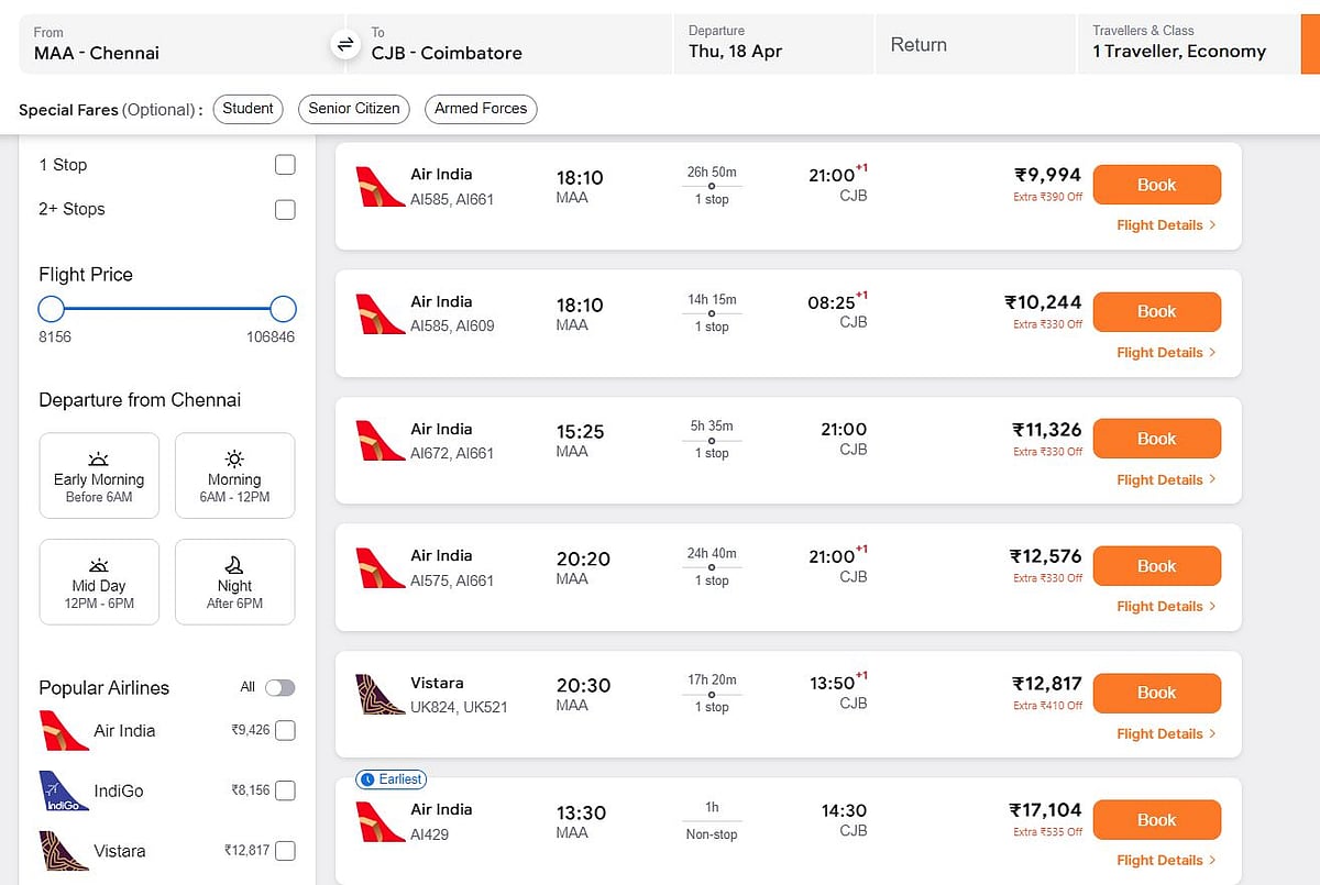 அதேபோல், மதுரை, தூத்துக்குடி உள்ளிட்ட தென் மாவட்டங்களுக்கு செல்லும் விமானங்களின் கட்டணம் ரூ.12,000 வரை விமான டிக்கெட் விற்பனை தளத்தில் விற்பனை செய்யப்பட்டு வருகின்றது.