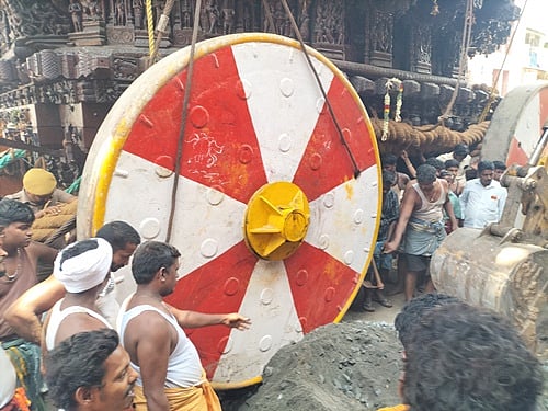 இதைத்தொடர்ந்து பள்ளத்தில் மணல், ஜல்லிக் கற்கள் உள்ளிட்டவை கொட்டப்பட்டு தேர் சக்கரத்தை மீட்கும் பணியில் தொழிலாளர்கள் ஈடுபட்டுள்ளனர்.
