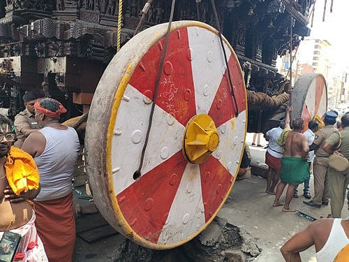 இத்தேர் முற்பகல் 10.30 - 10.45 மணியளவில் சாரங்கபாணி தெற்கு வீதிக்கு வந்தபோது திடீரென இடது புற சக்கரம் ஏறக்குறைய 5 அடி ஆழத்துக்கு திடீரென உள்வாங்கியது.