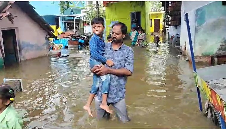 முழங்கால் அளவு மழைநீரில் நடந்து வருபவர்கள்.