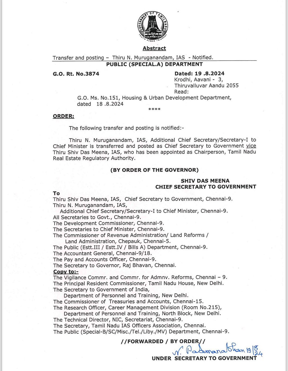 தலைமைச்செயலராக இருந்த சிவ்தாஸ் மீனா மாற்றப்பட்ட நிலையில் அவருக்கு பதில் நா.முருகானந்தம் புதிய தலைமைச் செயலராக நியமனம் செய்யப்பட்டுள்ளார். முதல்வரின் தனிச் செயலராக பணியாற்றிய முருகானந்தம் தற்போது தலைமைச் செயலராக நியமிக்கப்பட்டுள்ளார்.