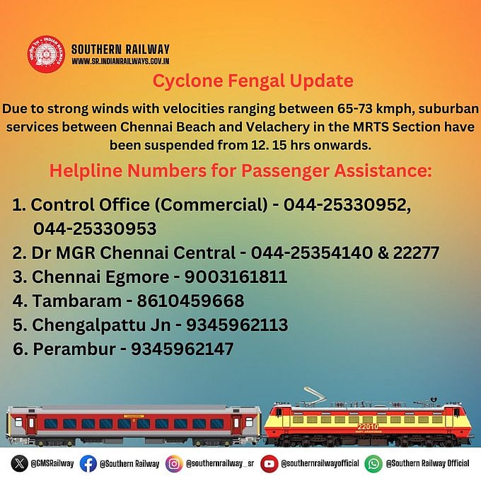 தெற்கு ரயில்வே தரப்பில் பயணிகளுக்கு உதவுவதற்காக உதவி எண்கள் அறிவிக்கப்பட்டுள்ளது.