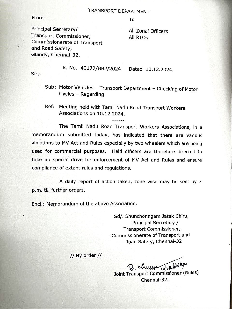 தமிழக போக்குவரத்து ஆணையரின் உத்தரவு