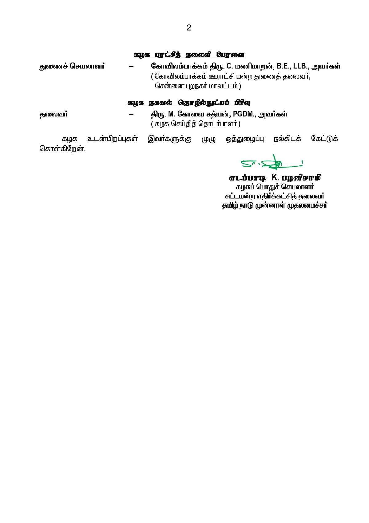 அதன்படி, அதிமுக தகவல் தொழில்நுட்பப் பிரிவுத் தலைவராக கோவை சத்யன்,