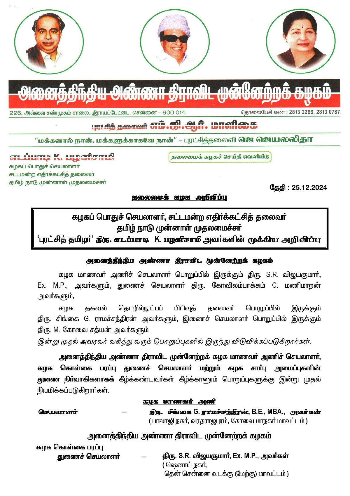 கொள்கை பரப்பு துணைச் செயலாளராக விஜயகுமார், புரட்சி தலைவி பேரவை அமைப்பின் துணைச் செயலாளராக கோவிலம்பாக்கம் மணிமாறன் ஆகியோர் நியமிக்கப்ட்டுள்ளனர்.