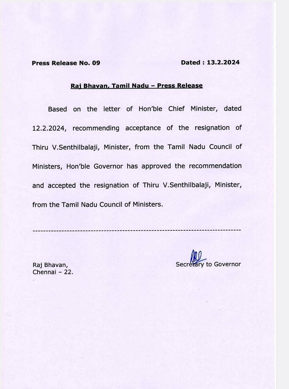 அமைச்சர் பதவியில் இருந்து விலகிய செந்தில் பாலாஜியின் ராஜிநாமா கடிதத்திற்கு ஆளுநர் ஆர். என். ரவி ஒப்புதல் அளித்துள்ளார்.