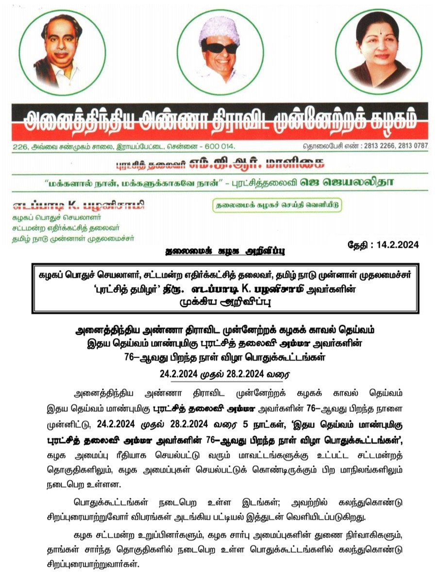 அனைத்திந்திய அண்ணா திராவிட முன்னேற்றக் கழகம் சார்பில் ஜெயலலிதாவின் 76-ஆவது பிறந்த நாள் விழா பொதுக்கூட்டங்கள் பிப். 24 முதல் 28 வரை 5 நாள்களுக்கு நடைபெறவுள்ளன.