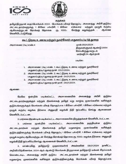 தமிழக மக்களின் கோரிக்கையை ஏற்று, அனைத்து குடும்ப அட்டைதாரர்களுக்கும் ரூ. 1000-த்துடன் பொங்கல் பரிசுத் தொகுப்பு வழங்கப்படும் என்று தமிழக முதல்வர் மு.க. ஸ்டாலின் அறிவித்துள்ளார்.