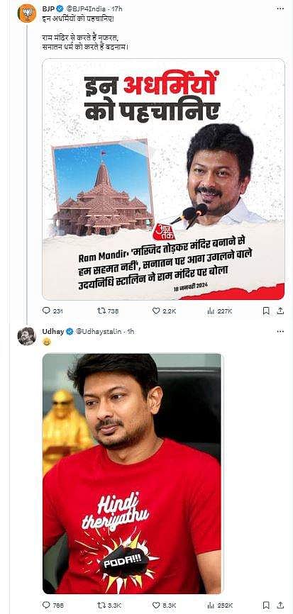 இந்த நிலையில், பாஜகவின் அதிகாரப்பூர்வ எக்ஸ் தளத்தில் நேற்று உதயநிதி ஸ்டாலினின் புகைப்படத்தை பதிவிட்டு, “இந்த அநியாயக்காரர்களை அடையாளம் காணுங்கள். ராமர் கோயிலை எதிர்த்து, சநாதன தர்மத்தை அவமதிக்கிறார்கள்.” என்று ஹிந்தியில் பதிவிட்டிருந்தனர்.