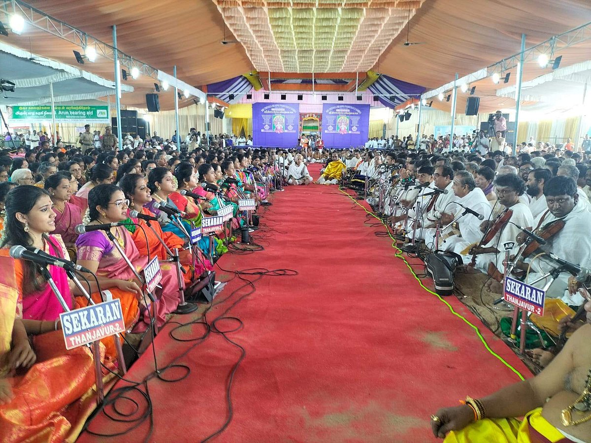 தஞ்சாவூர் மாவட்டம், திருவையாறு ஆராதனை விழாவில் செவ்வாய்க்கிழமை நடைபெற்ற பஞ்சரத்ன கீர்த்தனை நிகழ்ச்சியில் ஸ்ரீதியாகராஜருக்கு ஆயிரத்துக்கும் அதிகமான இசைக் கலைஞர்கள், ஆர்வலர்கள் கீர்த்தனைகளை பாடி அஞ்சலி செலுத்தினர்.