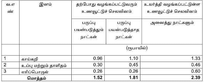 மதிய உணவுத் திட்டத்தின் கீழ் உணவு சமைப்பதற்காக வழங்கப்பட்டு வரும் உணவூட்டுச் செலவினத் தொகையினை உயர்த்தி வழங்கிட முதல்வர் மு.க.ஸ்டாலின் உத்திரவிட்டுள்ளார்.