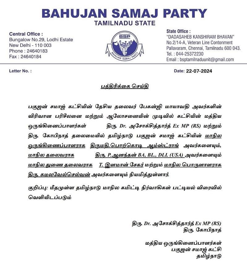 மேலும், கட்சியின் மாநில ஒருங்கிணைப்பாளராக ஆம்ஸ்ட்ராங்கின் மனைவி வழக்கறிஞர் பொற்கொடி, துணைத் தலைவராக இளமான் சேகர், பொருளாளராக கமலவேல் செல்வன் ஆகியோர் நியமிக்கப்பட்டுள்ளனர்.