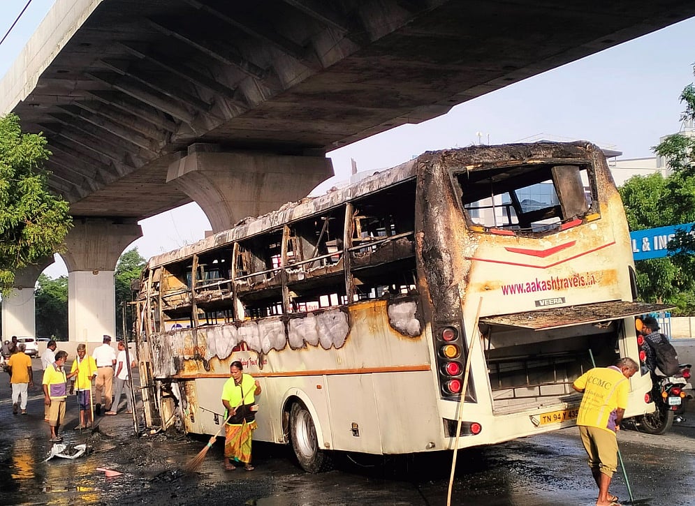 சம்பவ இடத்திற்கு வந்து தீயணைப்புத் துறையினர் தீயை அணைப்பதற்குள் பேருந்து முழுவதுமாக எரிந்து நாசமானது.