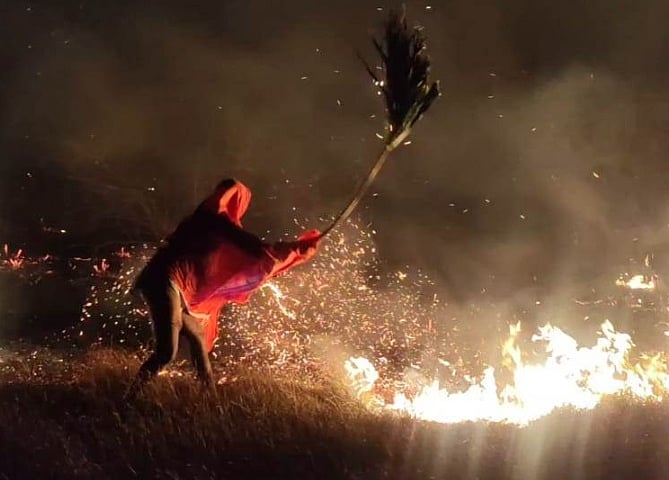 மேலநெட்டூர் கண்மாயில் தீப்பற்றி எரிந்த மரங்கள்: களத்தில் இறங்கிய கிராம மக்கள்
