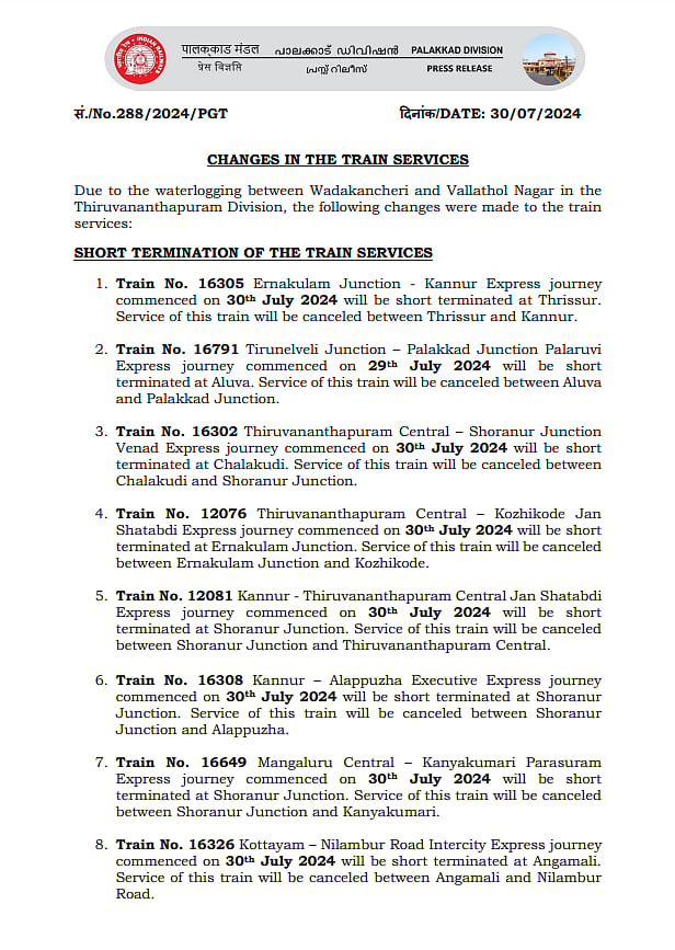 இந்த நிலையில், திருவனந்தபுரம் கோட்டத்துக்கு உள்பட்ட வள்ளத்தோள் நகர்-வடக்கஞ்சேரி ரயில் நிலையத்துக்கு இடையே தண்டவாளம் வெள்ள நீரில் மூழ்கியுள்ளதால் 20 ரயில்கள் பகுதியளவு ரத்து செய்யப்பட்டுள்ளது.