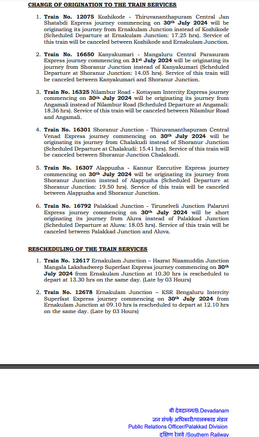 கன்னியாகுமரியில் இருந்து ஜூலை 31 புறப்பட வேண்டிய பரசுராம் ரயில், சொரனூர் சந்திப்பில் இருந்து நாளை பிற்பகல் 2.05 மணிக்கு புறப்படும் என்று தெரிவிக்கப்பட்டுள்ளது.
