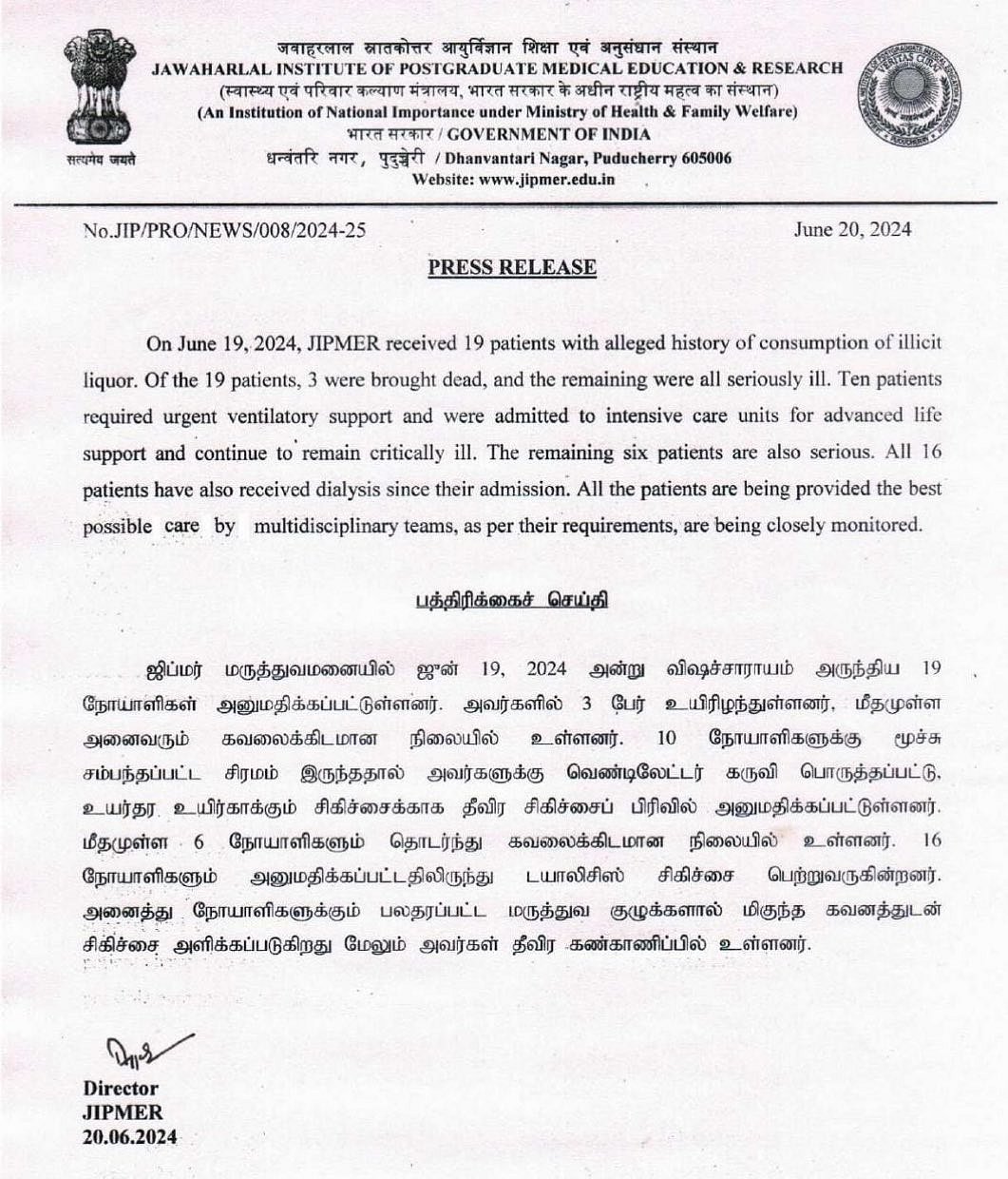 இந்த நிலையில், மருத்துவமனை நிர்வாகம் வெளியிட்டிருக்கும் அறிக்கையில், ஜிப்மர் மருத்துவமனையில் நேற்று கள்ளச்சாராயம் குடித்து 19 நோயாளிகள் அனுமதிக்கப்பட்டனர். அவர்களில் 3 பேர் உயிரிழந்துவிட்டனர். மீதமுள்ள அனைவரும் கவலைக்கிடமான நிலையில் உள்ளனர்.