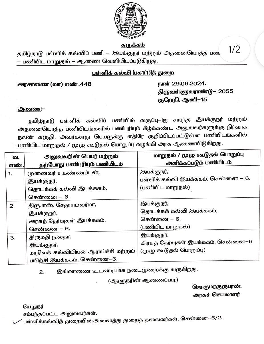 தமிழ்நாடு பள்ளிக் கல்விப் பணியில் வகுப்பு- I ஐ சார்ந்த இயக்குநர் மற்றும் அதனையொத்த பணியிடங்களில் பணிபுரியும் அலுவலர்களுக்கு நிர்வாக நலன் கருதி, இந்த பணியிட மாறுதல் மற்றும் முழு கூடுதல் பொறுப்பு வழங்கப்பட்டுள்ளதாகவும் அறிக்கையில் கூறப்பட்டுள்ளது.