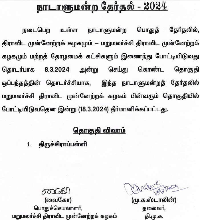 திமுக கூட்டணியில் மதிமுகவுக்கு திருச்சி மக்களவைத் தொகுதி ஒதுக்கீடு செய்யப்பட்டுள்ளது.