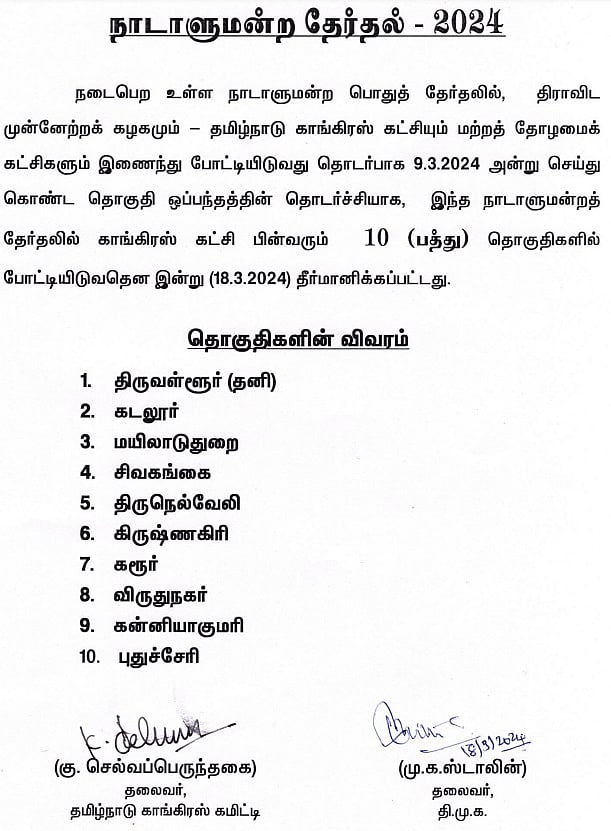காங்கிரஸுக்கு புதுச்சேரி உள்பட 10 தொகுதிகள் ஒதுக்கி சென்னை அண்ணா அறிவாலயத்தில் தமிழக முதல்வர் மு.க.ஸ்டாலினும், தமிழக காங்கிரஸ் கமிட்டு தலைவர் செல்வப்பெருந்தகையும் கடந்த வாரம் கையெழுத்திட்டனர்.