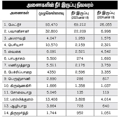 தமிழகத்தின் அணைகளில் திங்கள்கிழமை நிலவரப்படி நீா் இருப்பு 76.233 டிஎம்சி-யாக உள்ளது. இது மொத்த கொள்ளளவான 224.297 டிஎம்சியில் 33.99 சதவீம் மட்டுமே ஆகும். ஆனால், கடந்த ஆண்டு இதே நாளில் (மாா்ச் 19) முழு கொள்ளளவில் 60 சதவீதம், அதாவது 135.087 டிஎம்சி நீா் இருந்தது.