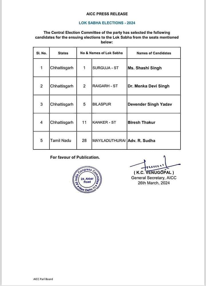 வேட்புமனு தாக்கல் புதன்கிழமையுடன் (மாா்ச் 27) நிறைவடையவுள்ள நிலையில் மயிலாடுதுறைக்கு மட்டும் காங்கிரஸில் வேட்பாளா் அறிவிக்கப்படாமல் இருந்தது, அந்தக் கட்சியினா் மத்தியில் குழப்பத்தை ஏற்படுத்தி வந்தது. இந்த நிலையில், மயிலாடுதுறை காங்கிரஸ் வேட்பாளராக ஆா். சுதா அகில இந்திய காங்கிரஸ் கமிட்டியால் செவ்வாய்க்கிழமை இரவு அறிவிக்கப்பட்டாா்.
