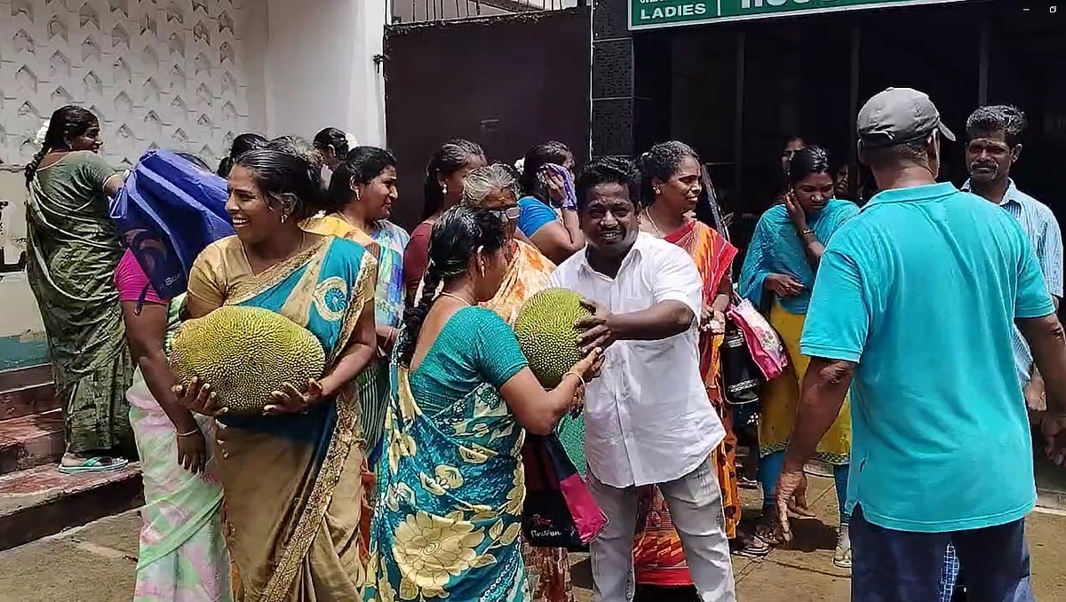 இதனையடுத்து படத்தின் முதல் காட்சியை பார்க்க வந்த நூற்றுக்கும் மேற்பட்ட பெண்கள் மற்றும் மாற்றுத்திறனாளிகளுக்கு இலவசமாக டிக்கெட்டை வழங்கியதுடன் தலா ஒருவருக்கு ஒரு பலாப்பழத்தையும் பரிசாக வழங்கினார்.
