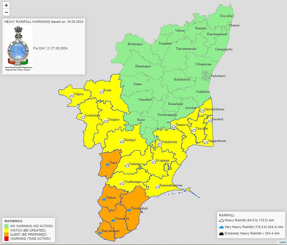 கன்னியாகுமரி, திருநெல்வேலி, தூத்துக்குடி, தென்காசி, தேனி ஆகிய 5 மாவட்டங்களில் ஒரு சில இடங்களில் இன்று(மே. 17) கனமழை முதல் மிக கனமழை பெய்ய வாய்ப்புள்ளதாக சென்னை மண்டல வானிலை ஆய்வு மையம் கணித்துள்ளது.